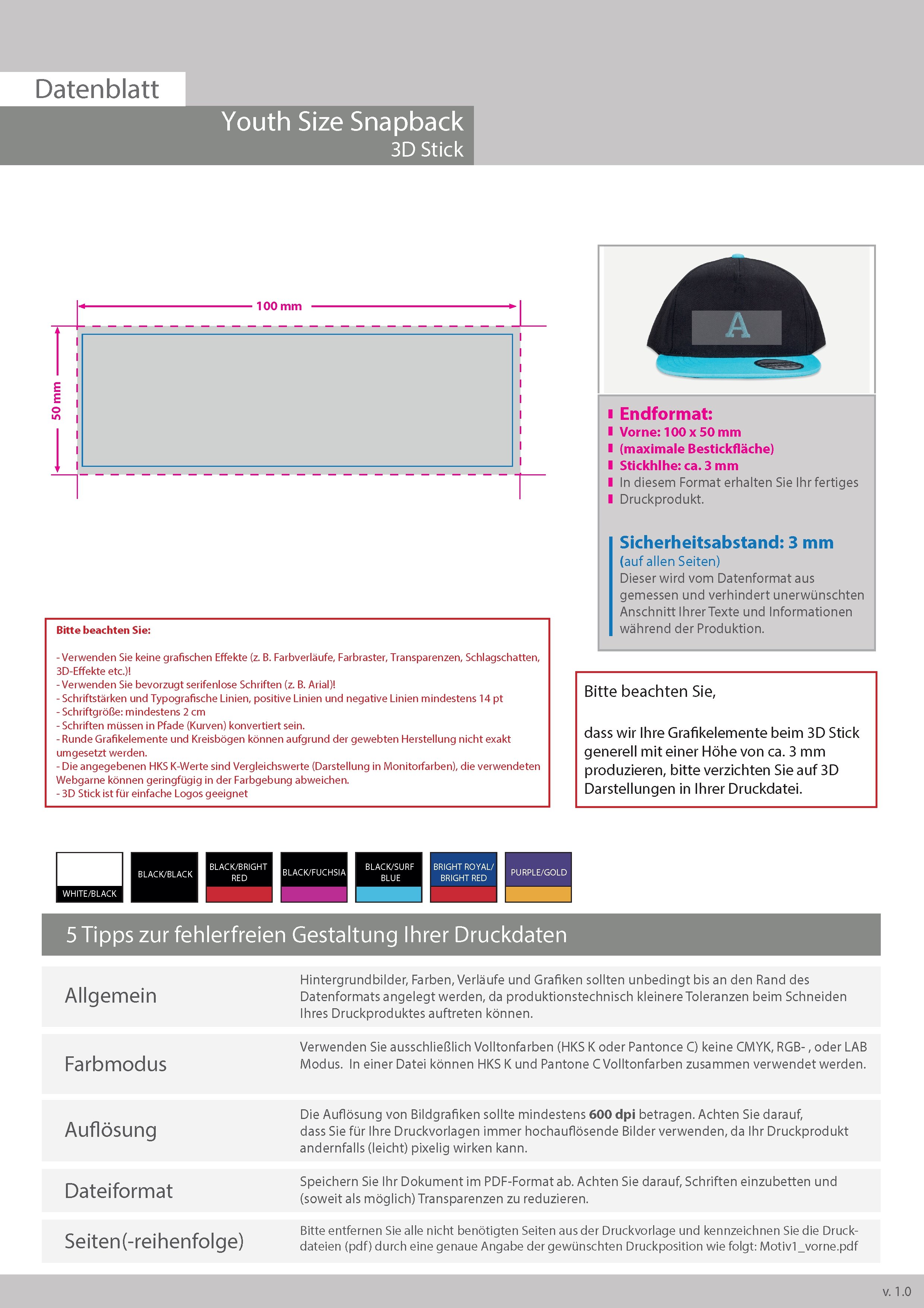 Youth Size Snapback Cap, mit EINER Stickposition (vorne mittig)